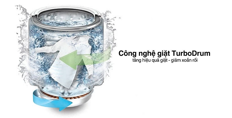 – Công nghệ giặt xoay chiều TurboDrum thiết kế với hoạt động lồng giặt và mâm giặt xoay ngược chiều nhau mang đến tác dụng tăng cường hiệu quả giặt sạch và giảm hiện tượng xoắn rối trên quần áo trong khi giặt.