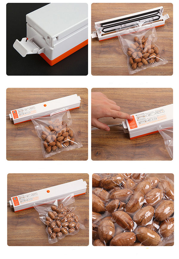 – Công dụng: Hút chân không + hàn túi nilon giúp bảo quản thực phẩm tốt hơn, lâu hơn và giữ được dinh dưỡng của thực phẩm.
