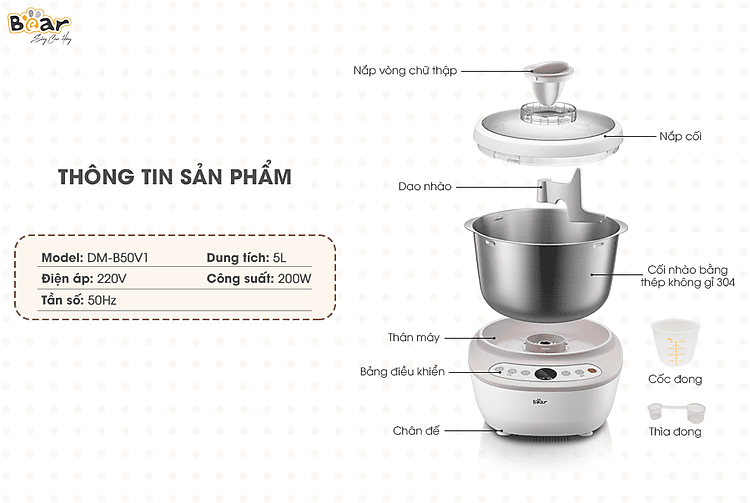 Ngoài ra dưới đáy chân đế còn được gắn thêm miếng đệm silicon giúp máy hoạt động êm ái mà không bị rung lắc, đây là điểm cộng mà Bear luôn để mắt đến khi thiết kế sản phẩm gia dụng. Đi kèm máy trộn và ủ bột Bear 5 lít còn có thêm cốc đong và thìa đong giúp thuận tiện trong quá trình làm bánh.