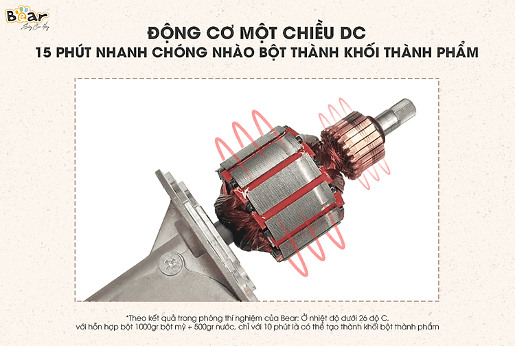 Máy trộn bột Bear sử dụng công nghệ trộn tân tiến mới nhất với động cơ một chiều DC giúp nhào bột kéo màng chỉ 15 phút, nhanh hơn gấp 2-3 lần bình thường.