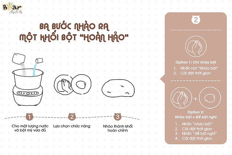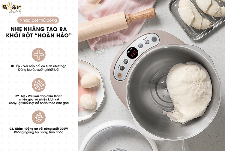 Thay vì để bột nghỉ ở ngoài môi trường với nhiệt độ thay đổi thất thường làm khối bột hay bị nhão quá hoặc khô quá. Chế độ ủ bột tự động của máy trộn bột Bear luôn giữ mức nhiệt ủ bột lý tưởng từ 35-40 độ C. Ngoài ra, chế độ ủ bột này sẽ kích thích men nở hoạt động tốt nhất, tạo nên khối bột dai, nở phồng hơn nhiệt độ thường.