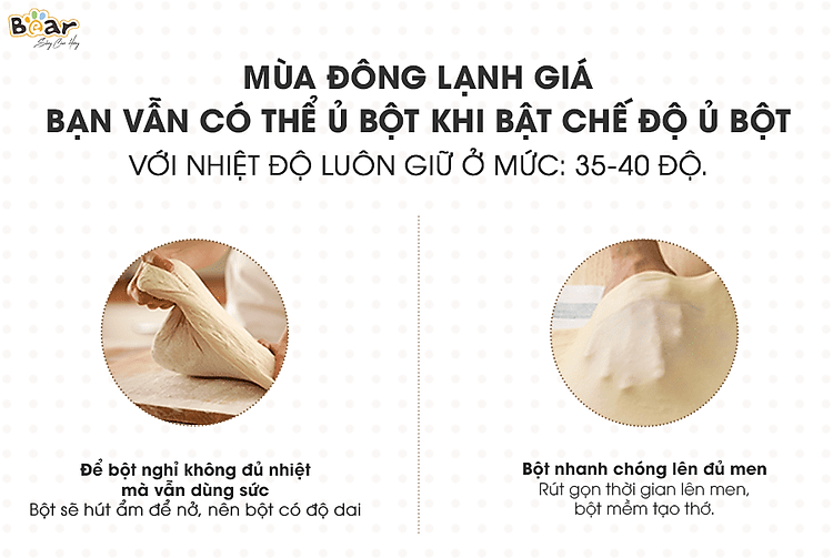 Thay vì để bột nghỉ ở ngoài môi trường với nhiệt độ thay đổi thất thường làm khối bột hay bị nhão quá hoặc khô quá. Chế độ ủ bột tự động của máy trộn bột Bear luôn giữ mức nhiệt ủ bột lý tưởng từ 35-40 độ C. Ngoài ra, chế độ ủ bột này sẽ kích thích men nở hoạt động tốt nhất, tạo nên khối bột dai, nở phồng hơn nhiệt độ thường.