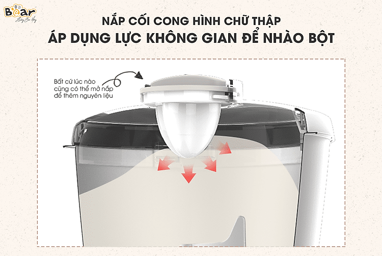Chất lượng bột đánh của máy trộn bột 5L Bear trở nên hoàn hảo hơn so với thông thường cũng bởi máy còn có các chi tiết nhỏ hữu ích mà tinh tế. Nắp âu trộn được thiết kế trong suốt có nắp mở nhỏ thêm nguyên liệu dễ dàng. Điểm đặc biệt của chiếc nắp mở thêm nguyên liệu này chính là hình dáng thiết kế chữ thập như một lực tác động khi trộn khối bột lớn. Thiết kế chữ thập này sẽ tạo thêm lực ép từ phía trên xuống vừa giúp bột không dính nắp mà còn hỗ trợ nhồi bột.