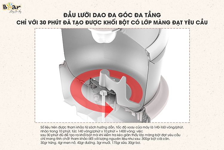 Máy trộn bột Bear sử dụng công nghệ trộn tân tiến mới nhất với động cơ một chiều DC giúp nhào bột kéo màng chỉ 15 phút, nhanh hơn gấp 2-3 lần bình thường.
