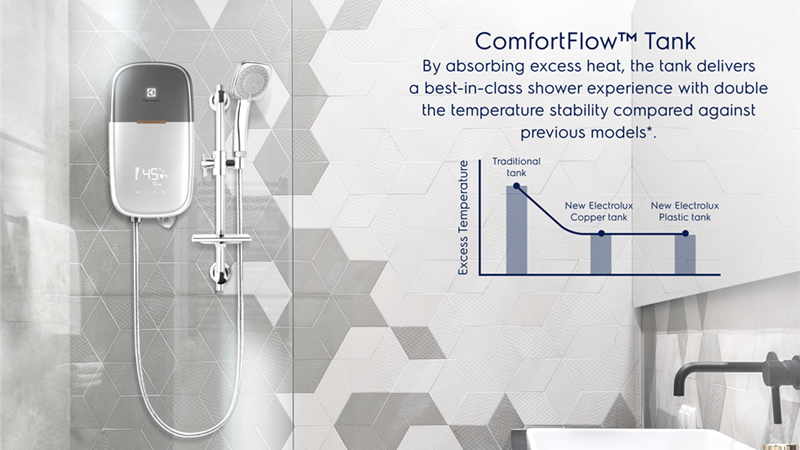 Công nghệ bình chứa ComfortFlow hấp thụ nhiệt dư để đảm bảo nhiệt độ nước ổn định gấp 2 lần so với các dòng máy trước