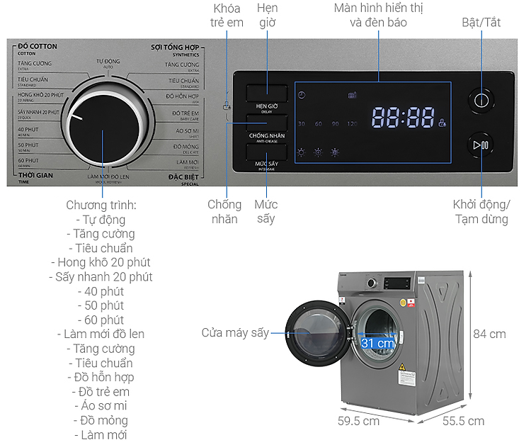 - Tiện ích:Làm mới quần áo trong 20 phútKhóa trẻ emHẹn giờ hoàn thànhChương trình sấy nhanhChỉnh mức độ sấyCông nghệ SenseDry giữ bền màu, tiết kiệm điệnSấy chống nhăn