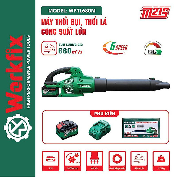 Máy Thổi Bụi, Thổi Lá Workfix - WF-TL680M - Công Suất Lớn, 6 Cấp Tốc Độ, Cấp Gió - Làm Sạch sân vườn nhà cửa - Chân Phổ Thông 1 Qua Pin 15 cell- Bảo Hành Chính Hãg 6 Tháng