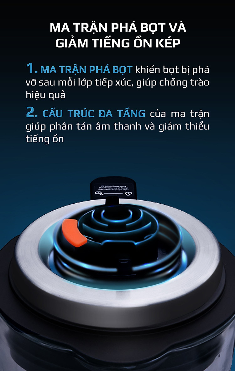 - Thiết kế mê cung phá bọt với cấu trúc đa tầng khiến bọt bị phá vỡ hoàn toàn, nắp được gia cố thêm phần gioăng cao su 2 lớp cùng khóa an toàn giúp loại bỏ hoàn toàn vấn đề trào nước thực phẩm ra phần nắp mà nhiều sản phẩm khác trên thị trường thường gặp phải.
