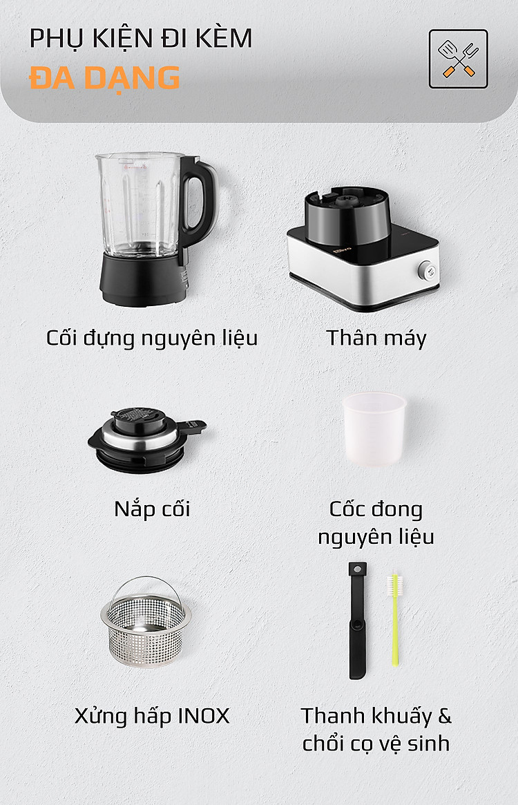 - Với 14 chế độ chức năng : Nấu cháo mịn, làm sữa hạt, nấu cháo nguyên hạt, nấu món hầm, hấp, nấu súp, làm sữa không nấu, làm sinh tố, xay lạnh , xay khô nhiều công dụng tích hợp trong chỉ 1 chiếc máy.