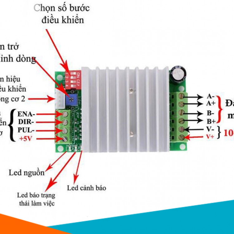- Chip điều khiển: TB6600 công suất cao, có khả năng tự ngắt khi điện áp thấp, nhiệt độ cao, bảo vệ quá dòng và ngắn mạch