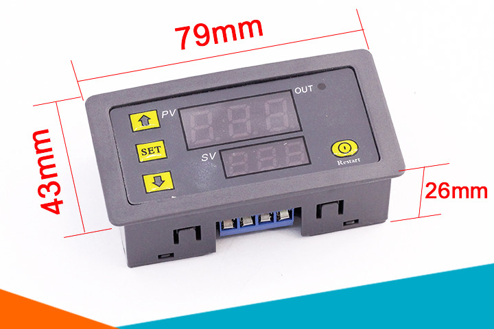Khi bắt đầu cài đặt, bạn ấn nút SET 1 lần để vào chế độ cài đặt thời gian ( đèn màu đỏ nhấp nháy ). Sau đó điều chỉnh thời gian T1 bằng cách ấn nút trừ (-). Sau khi cài đặt xong T1, nhấn nút SET lần nữa ( đèn xanh nhấp nháy ) để và cài đặt T2. sau khi cài đặt T2 xong quý khách nhấn SET một lần nữa và đợ 6s để thiết bị lưu dữ liệu.