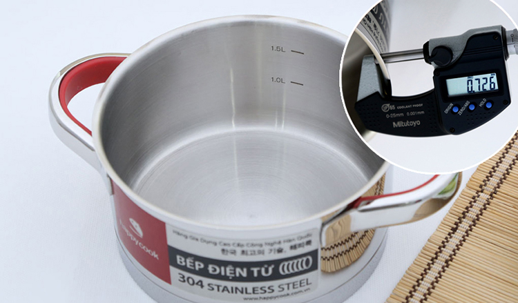 • Nồi inox cao cấp 3 đáy nắp kiếng Happy Cook Richard Plus N16-RSP được làm bằng inox 304 chất lượng cao, không ra ten, không bị oxi hóa, đảm bảo an toàn thực phẩm. Bên trong nồi có thang đo mực nước.