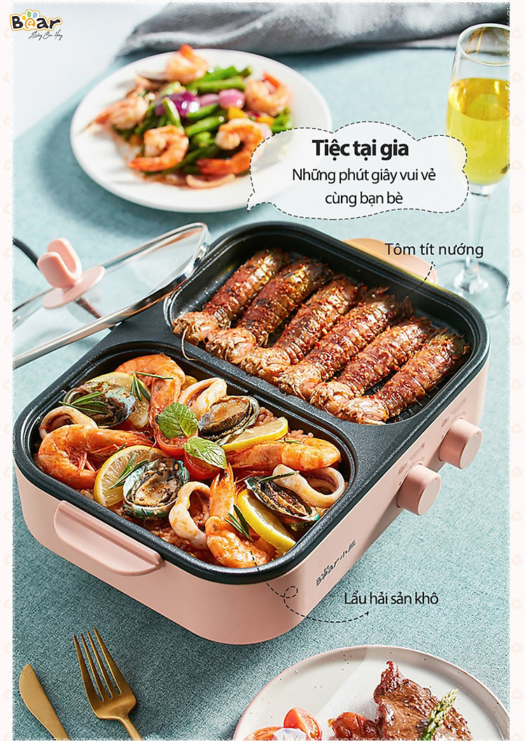 Thưởng thức 2 phong cách ăn cùng lúc với nồi nướng lẩu mini Bear DKL-C12D1 tích hợp 6 chức năng: Chiên, nướng, luộc, xào, nấu lẩu, áp chảo ngay tại gia. Nồi nướng lẩu mini Bear DKL-C12D1 sở hữu thiết kế thông minh với 2 khay Nướng - Lẩu vừa phải thích hợp cho 2-3 người ăn kết hợp cùng công suất 1200W và phù chống dính tiện lợi cho việc vệ sinh sau khi sử dụng. Tham khảo ngay!