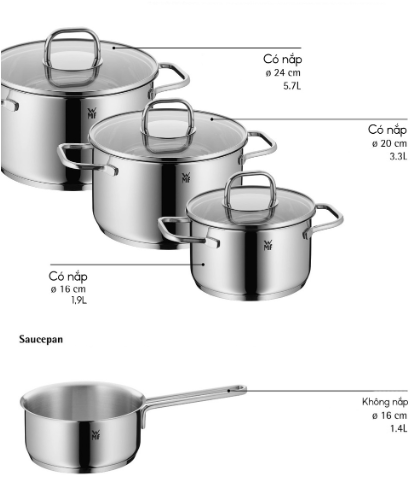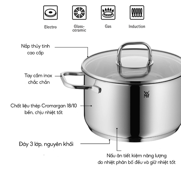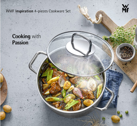- Bộ nồi WMF Inspiration 4PC Cookware Set thích hợp sử dụng trên mọi loại bếp, kể cả bếp từ, bếp hồng ngoại.