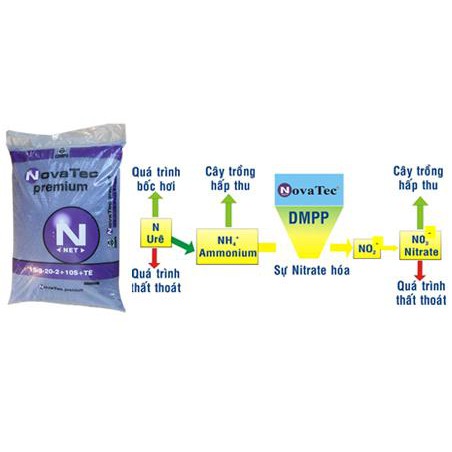 NovaTec premium với công nghệ DMPP giúp hạn chế quá trình chuyển hóa đạm Amôn NH4 thành đạm Nitrate NO3 (Đạm NO3 rất dễ bị rửa trôi và bốc hơi). Đạm được dự trữ ở trong đất, cây trồng sẽ hấp thu theo nhu cầu sinh trưởng và phát triển theo từng giai đoạn. Cho nên, hạn chế tối đa quá trình thất thoát đạm và các chất dinh dưỡng.