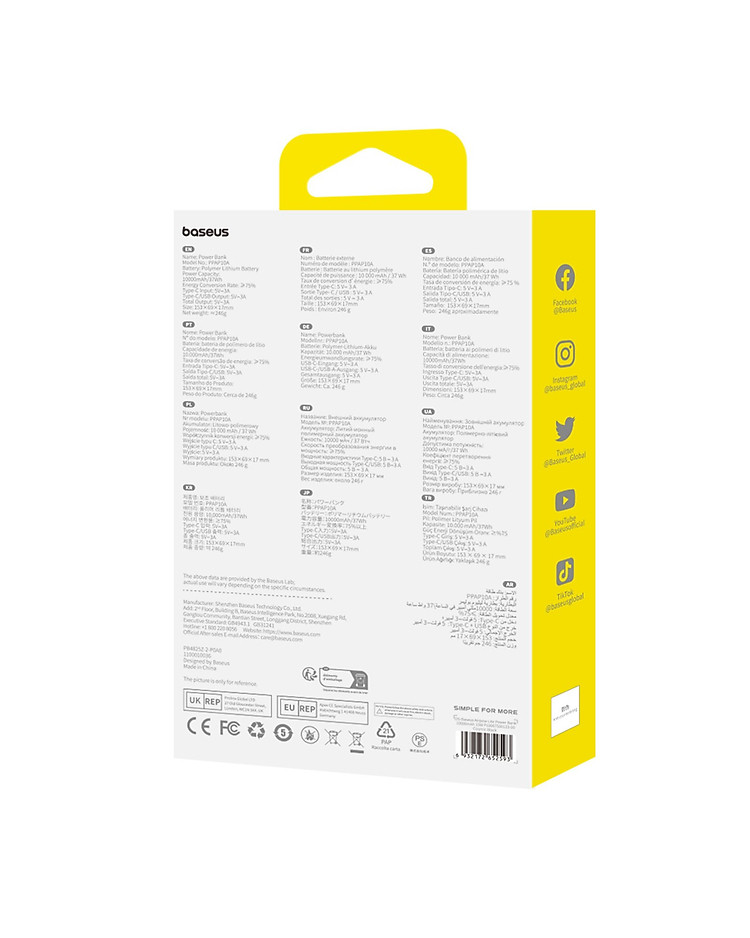 Thông số kỹ thuật:Dung lượng pin: 10000mAh/37WhLõi Pin: Pin Lithium PolymerTỷ lệ chuyển đổi năng lượng: khoảng 75%Đầu vào Type-C: 5V/3AĐầu ra Type-C/USB: 5V/3ATổng đầu ra: 5V/3AKích thước: 153x69x17m...