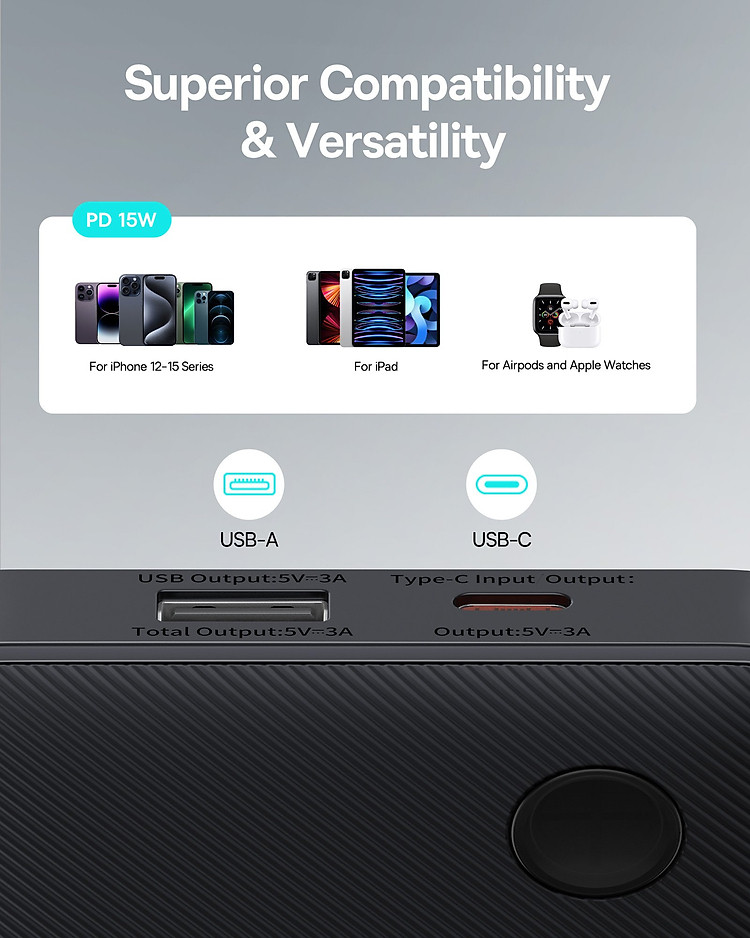 Công Suất Sạc Nhanh 15W: Với công suất sạc 15W, sản phẩm này giúp tiết kiệm thời gian sạc và đảm bảo thiết bị của bạn luôn sẵn sàng sử dụng.