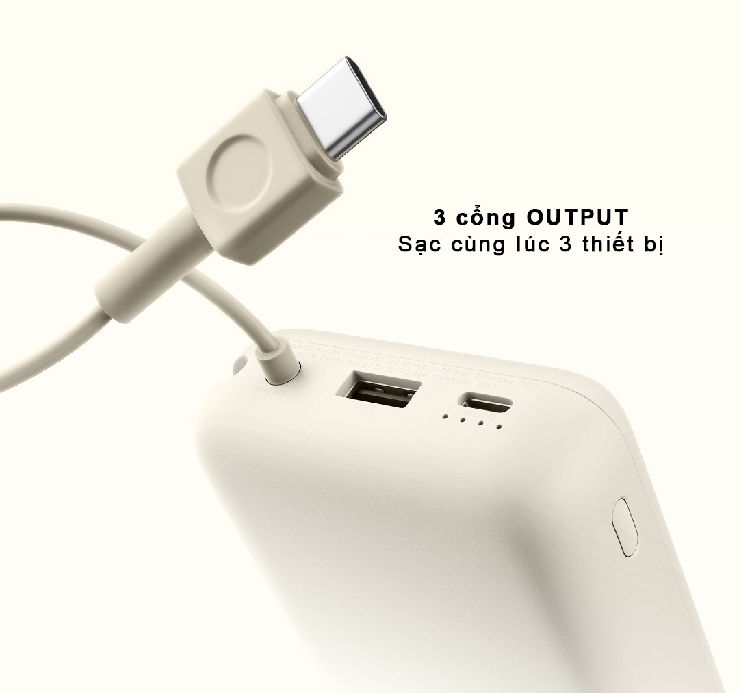 Ngoài cáp sạc Type-C, pin dự phòng sạc nhanh 33W còn được trang bị 2 cổng USB-A và USB-C, có thể xuất cùng lúc, hỗ trợ sạc đồng thời cho cả 3 thiết bị khác nhau như điện thoại, máy tính bảng, tai nghe,… một cách ổn định và nhanh chóng. Giải quyết tốt nhu cầu về thời lượng pin của nhiều thiết bị trong quá trình di chuyển.