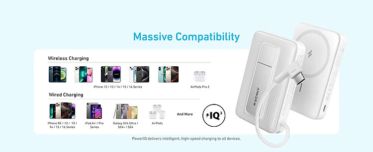 Sạc dự phòng hít từ tính Anker Zolo A1685 10000 mah mà còn tương thích với nhiều thiết bị khác. Bất kỳ thiết bị nào hỗ trợ sạc không dây chuẩn Qi đều có thể sử dụng được, bao gồm cả các dòng điện thoại Android. Ngoài ra, với cổng USB-C tích hợp, thiết bị này còn có thể sạc các loại máy tính bảng, tai nghe không dây, và các thiết bị có cổng USB-C khác, tạo nên tính linh hoạt và đa dụng cao.