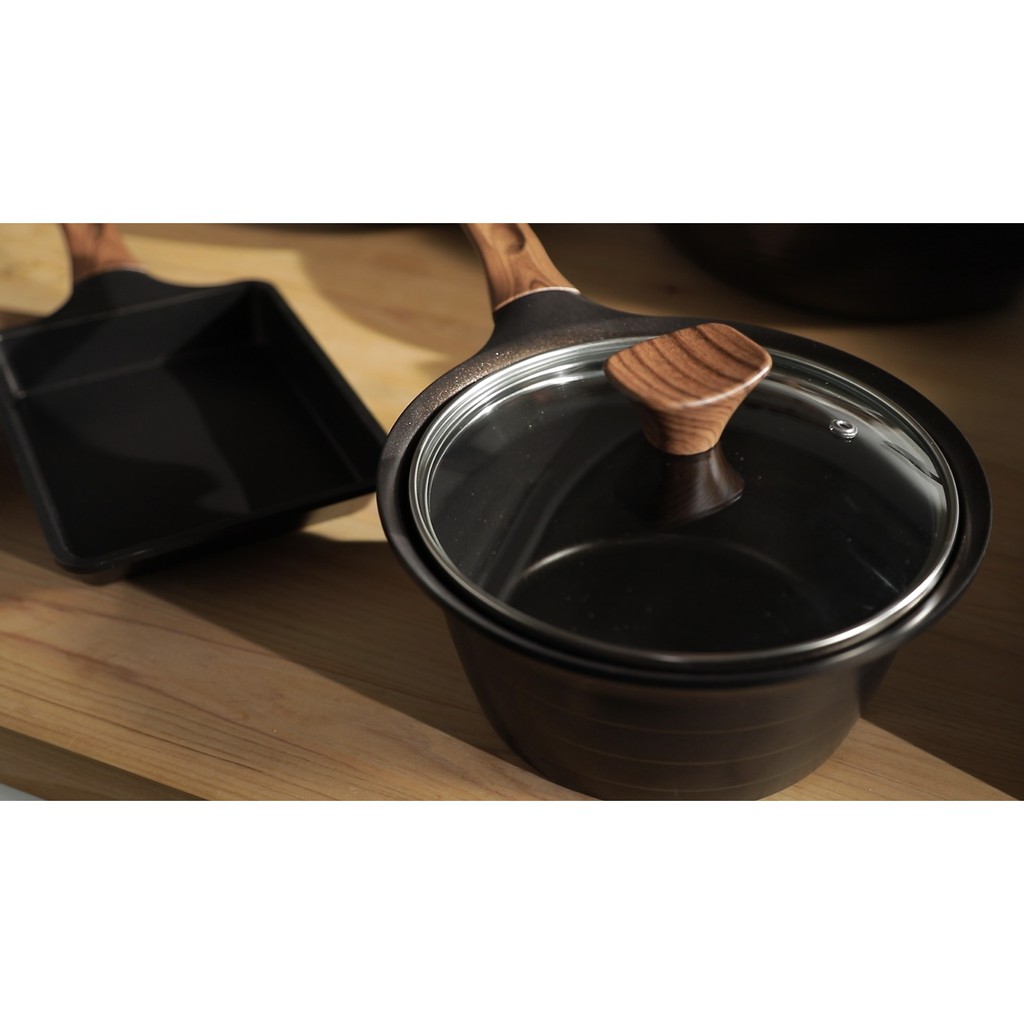 Tay cầm của cán chảo và núm nắp đậy thủy tinh có thiết kế màu gỗ thiên nhiên đẹp mắt. Chất liệu Bakelite (Nhựa gỗ tổng hợp) tăng độ bền cho các chi tiết tay cầm, lại tạo sự nhẹ nhàng cho sản phẩm. Các vân gỗ hài hòa cùng màu sắc chủ đạo của thành nồi. Tay cầm kết hợp giữa sự vừa vặn và thoải mái tạo cảm hứng vui thích và an toàn cho các chị em nội trợ.