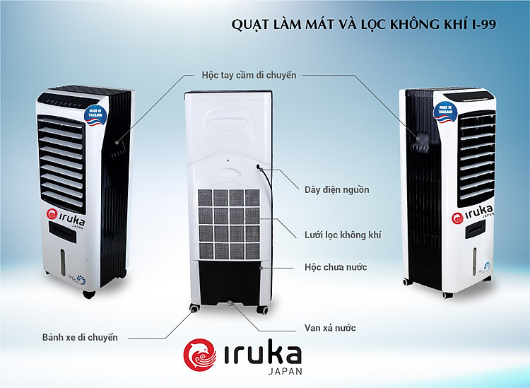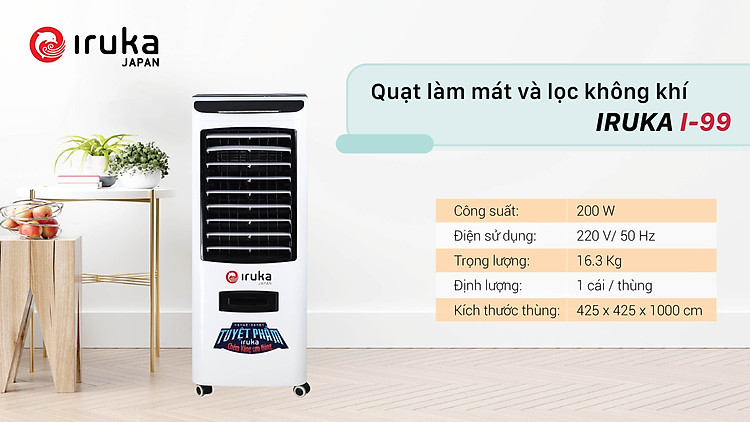 Quạt làm mát lọc không khí Iruka I-99 là một trong những sản phẩm quạt điều hòa không khí đang chiếm ưu thế trên thị trường hiện nay so với các dòng sản phẩm còn lại vì được tích hợp nhiều tính năng hiện đại cho mọi không gian sinh hoạt.