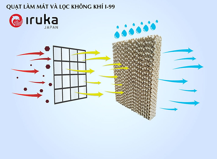 Quạt làm mát và lọc không khí Iruka I-99 không khí đảm bảo một hướng lấy gió vào từ phía sau lưới lọc 16 ô, được lọc một lần nữa qua lưới lọc gỗ sồi tạo ra luồng gió mát và ion âm. Ion âm cô lập các tạp chất có trong không khí và khử mùi khử khuẩn mang đến không gian trong lành hơn.