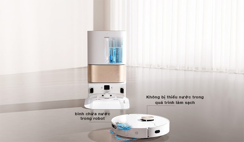 Dreame L10S Ultra đi kèm với một bình chứa nước. Mỗi khi giẻ lau được rửa lại, trạm gốc sẽ tự động bổ sung vào bình chứa nước của robot để đảm bảo độ ẩm không đổi của giẻ lau