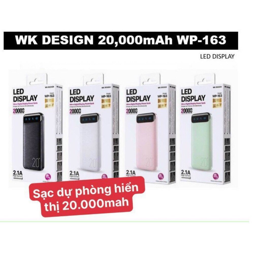 👍Sạc dự phòng 20.000mAh nhỏ gọn thời trang WP-163 sạc 2 thiết bị cùng lúc. Hỗ trợ sạc nhanh 2.1A. Chất liệu nhựa PC+ABS, an toàn, chống cháy nổ.