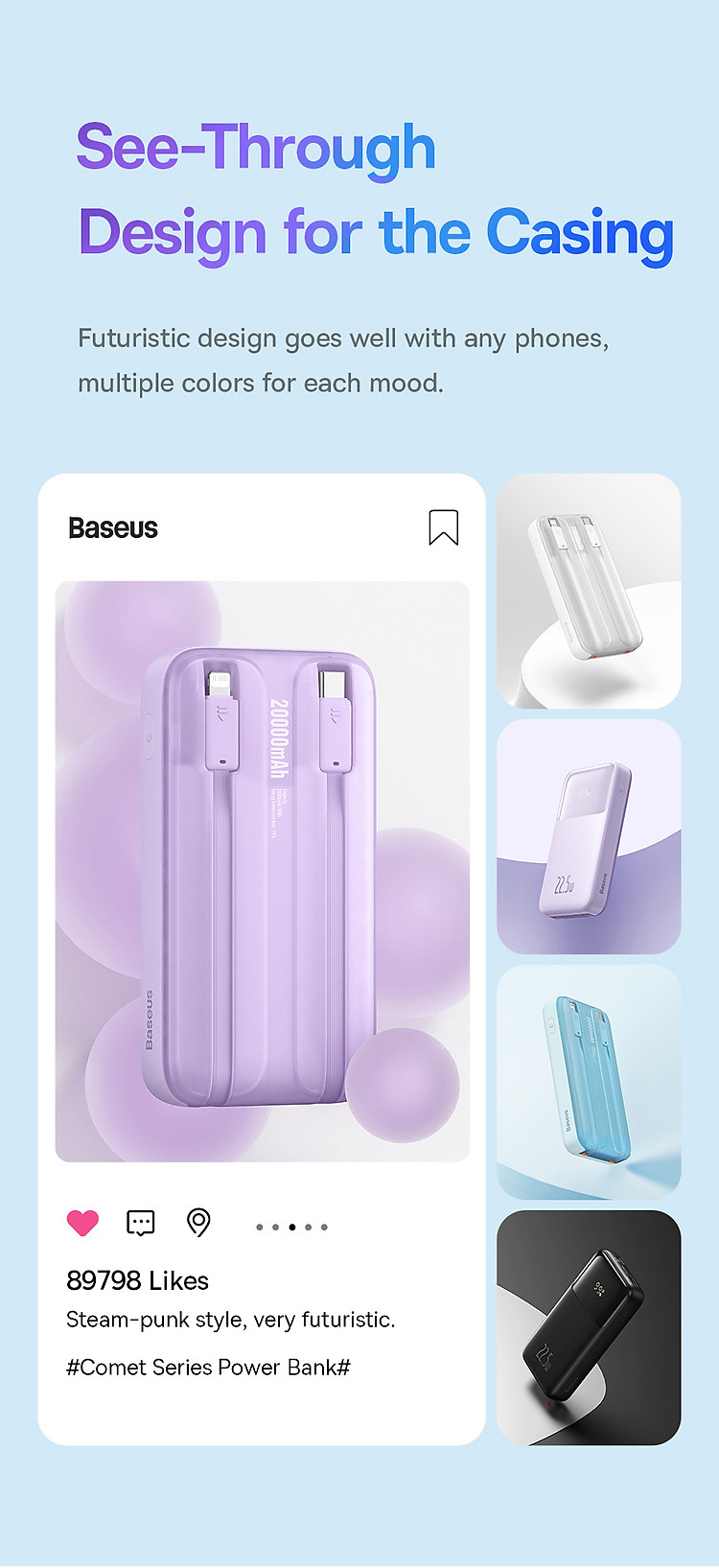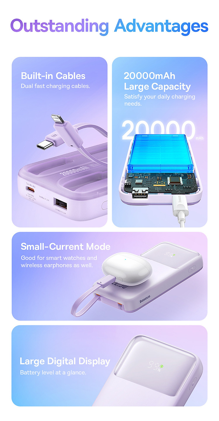 Sạc Dự Phòng OS-Baseus Comet Series Dual-Cable Digital Display Fast Charge Power Bank là một sản phẩm sạc dự phòng tiện dụng của thương hiệu Baseus. Thiết bị này được trang bị màn hình LED số hiển thị dung lượng pin còn lại và dòng điện đầu ra, giúp người dùng dễ dàng quan sát và kiểm soát sạc của thiết bị.