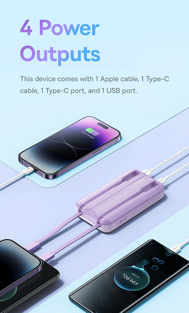 Ngoài ra, sản phẩm còn được trang bị nhiều cổng sạc, giúp người dùng có thể sạc đồng thời cho hai thiết bị khác nhau. Đi kèm với sản phẩm là một dây sạc USB to C 30cm chất lượng cao, giúp người dùng có thể sạc cho các thiết bị hỗ trợ cổng sạc loại này.