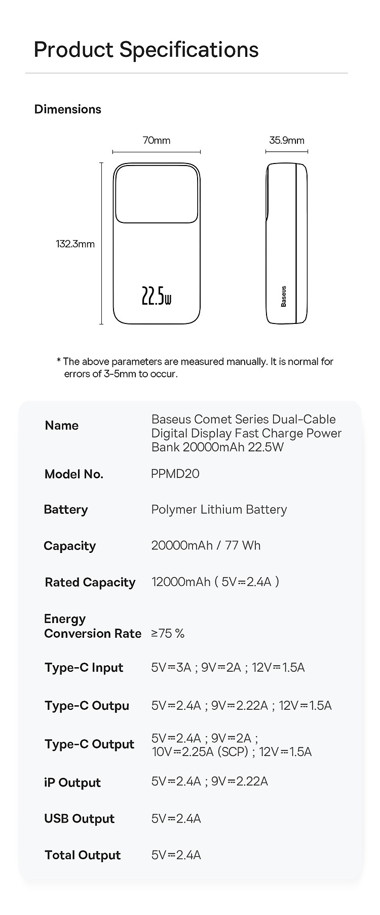 | Type-C Output | 5V-2.4A, 9V-2.22A, 12V-1.5A |