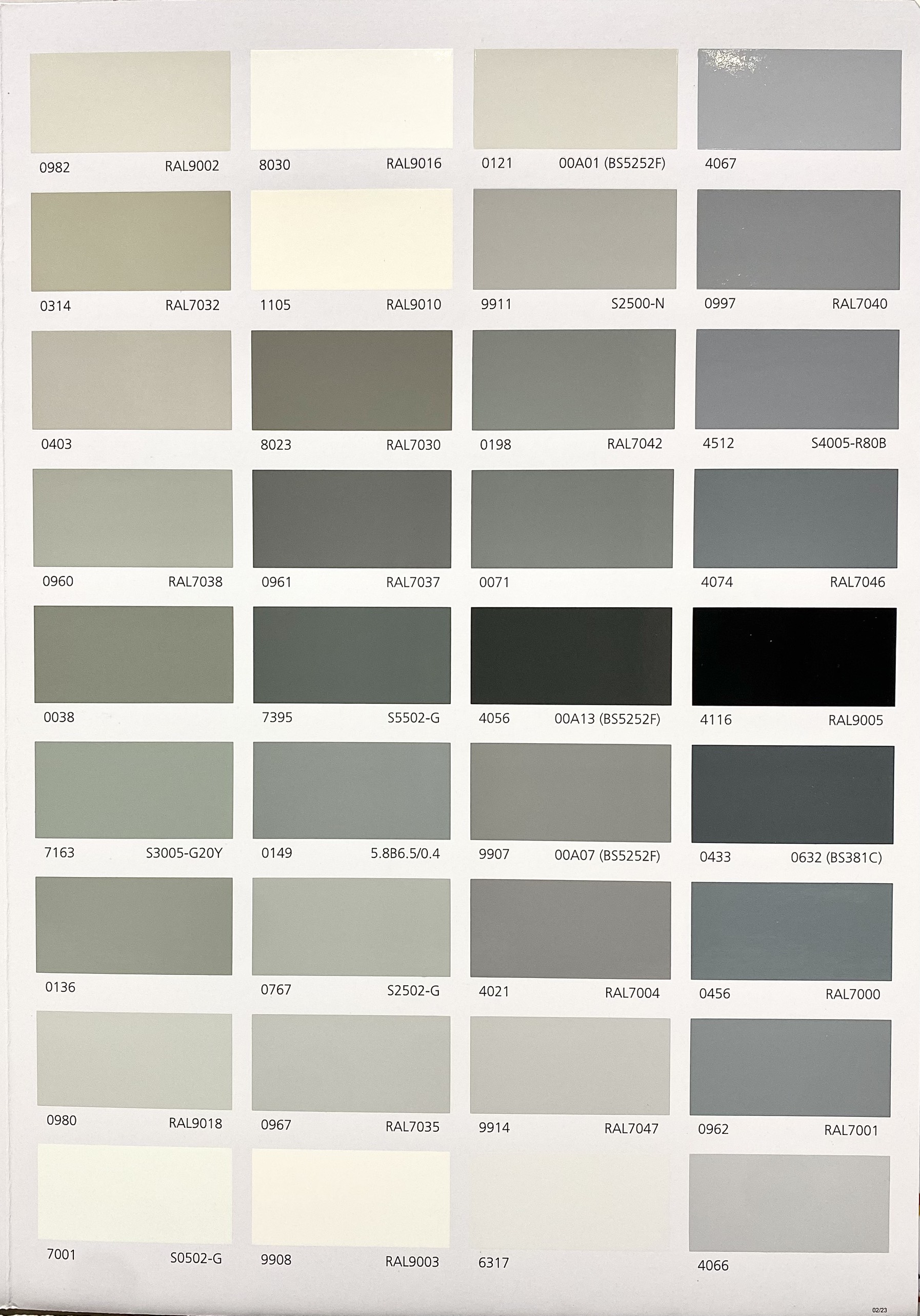 Màu sắc sơn công nghiệp Jotun: Theo bảng màu và hệ thống pha sơn công nghiệp tự động (MCI) Ivory White 566, Yellow 414, Orange 436, Yellow 258, Red 926 (Ral 3000), Ral 1004, Red 49, White 0001, Black0099, Ral 3013, Tomato Red 2079, Ral 2001, Yellow 2, Green 137, Signal Green 7075, Ral 6032, Green 431, Green 437, Blue 139, Blue 599, Blue 129, Grey 38, grey 136, Grey 403, Light grey 967, Ral 7035, grey 433, grey 149, grey 456, ral 7000, ral 5002, ral 5005, ral 6000, ral 6001, ral 6011, ral 1003, ral 1015, ral 3020, ral 8017, ral 9001…