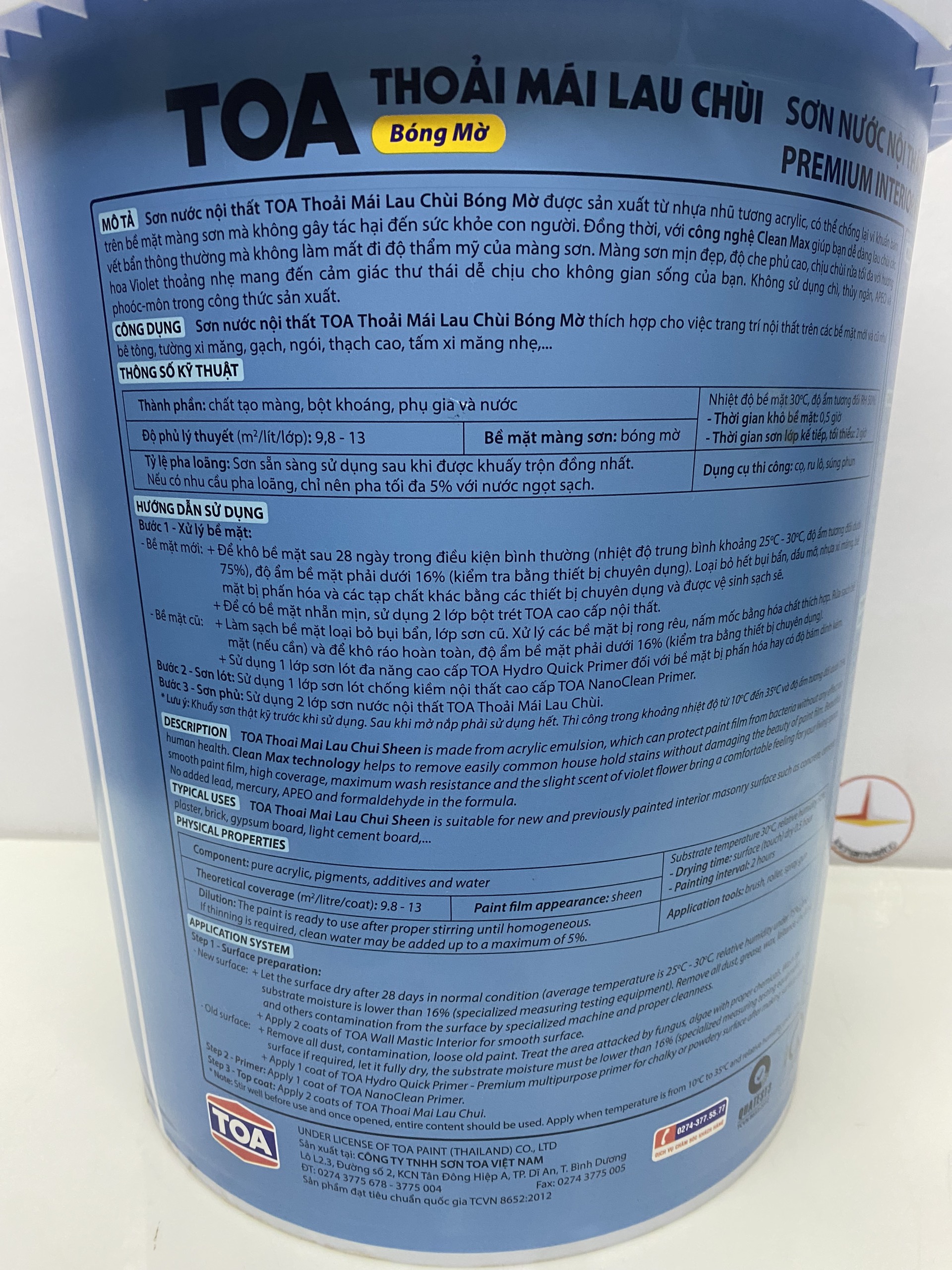 Sơn nước nội thất cao cấp TOA Thoải Mái Lau Chùi Bóng Mờ được sản xuất từ nhựa nhũ tương acrylic, có thể chống lại vi khuẩn bám trên bề mặt màng sơn mà không gây tác hại đến sức khỏe con người. Đồng thời, với công nghệ Clean Max giúp bạn dễ dàng lau chùi các vết bẩn thông thường mà không làm mất đi độ thẩm mỹ của màng sơn. Màng sơn mịn đẹp, độ che phủ cao, chịu chùi rửa tối đa với hương hoa Violet thoảng nhẹ mang đến cảm giác thư thái dễ chịu cho không gian sống của bạn. Không sửa dụng chì, APEO và phoóc-môn trong công thức sản xuất..