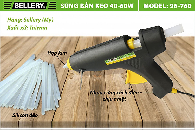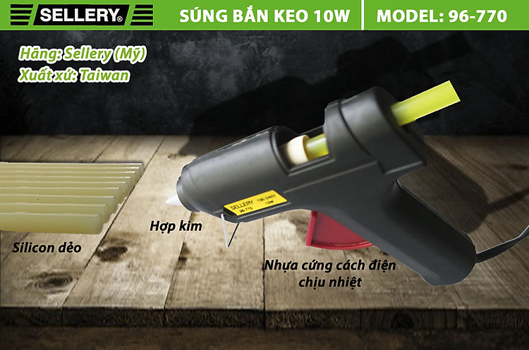 - Súng bắn keo Sellery 96-760, 96-770 được làm từ nhựa cứng có độ bền cao, cho thời gian sử dụng lâu dài. Sản phẩm được sản xuất dựa trên công nghệ hiện đại, đáp ứng được đầy đủ yêu cầu về kỹ thuật cũng như độ an toàn khi hoạt động.