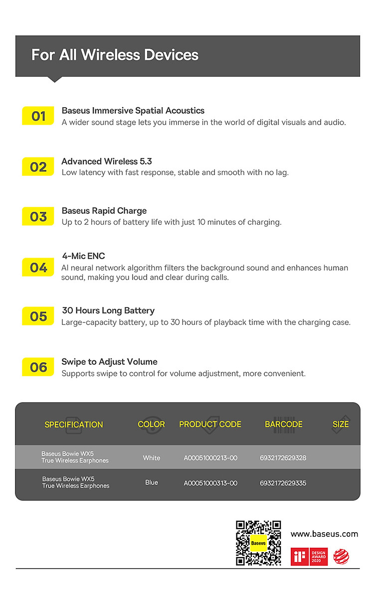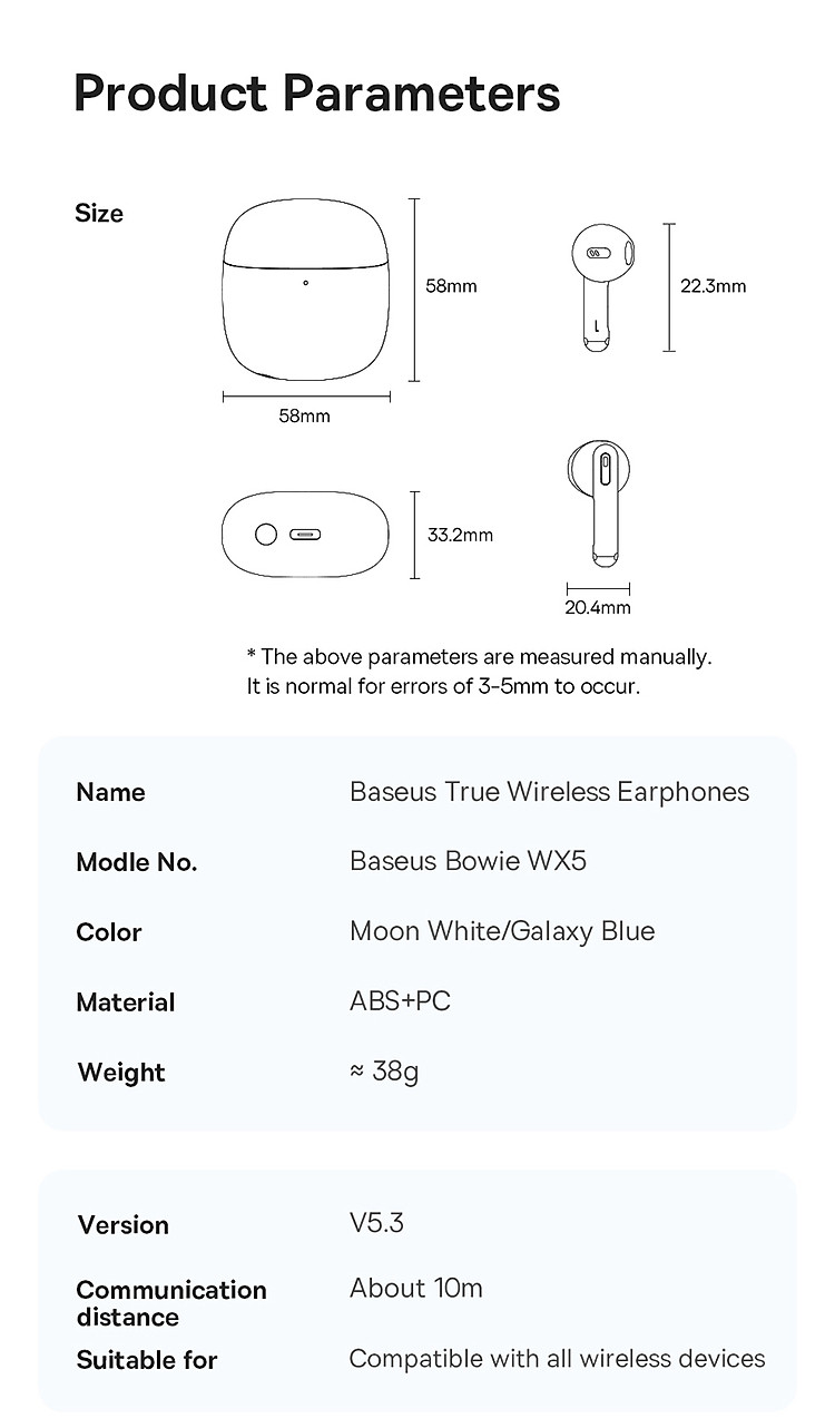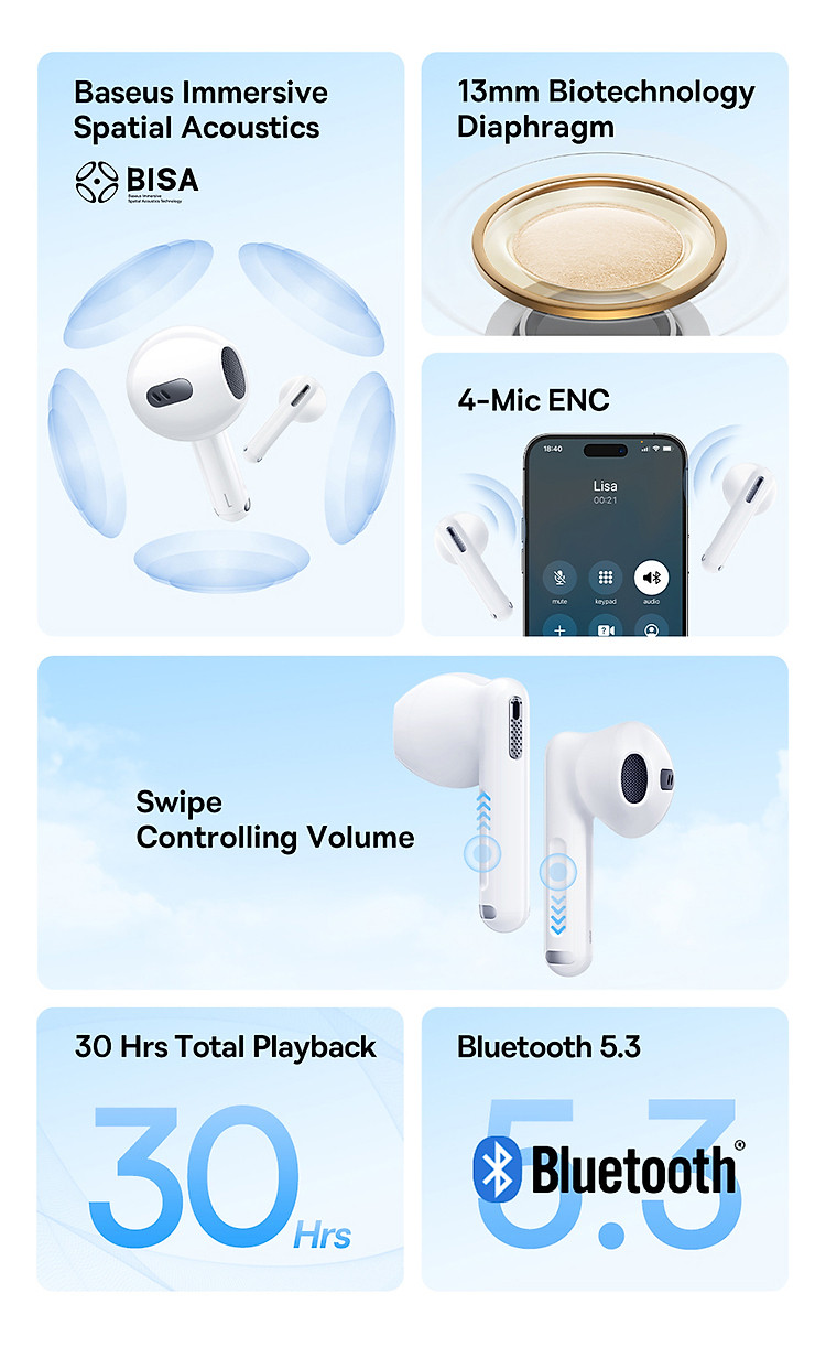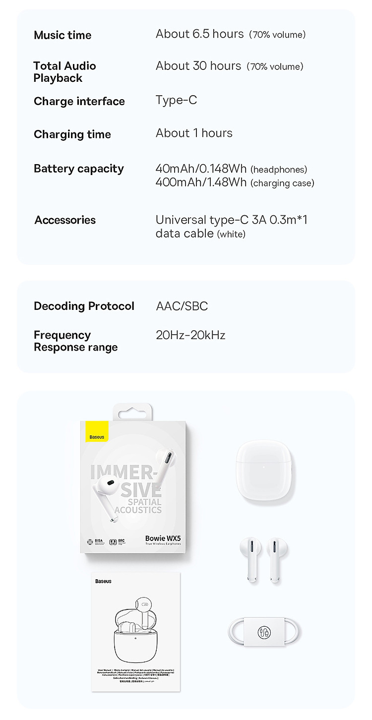 Tai nghe OS-Baseus Bowie WX5 True Wireless Earphones có kiểu dáng nhỏ gọn và không có dây, cho phép bạn tự do di chuyển mà không bị ràng buộc bởi dây cáp. Mỗi bên tai nghe có thiết kế tinh tế với một phần tai nghe chính và một phần tai nghe nhỏ hơn đi kèm, đảm bảo ôm sát và vừa vặn với tai của bạn.