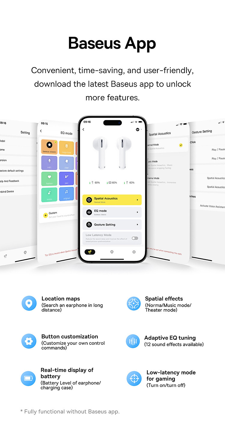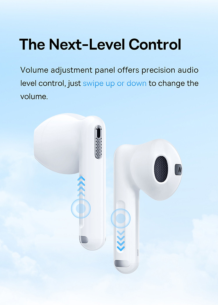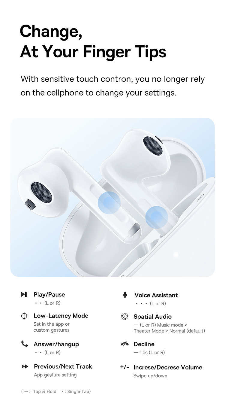 Tai nghe OS-Baseus Bowie WX5 True Wireless Earphones cũng có tính năng điều khiển cảm ứng thông minh, cho phép bạn dễ dàng điều chỉnh âm lượng, chuyển bài hát và nhận cuộc gọi chỉ bằng cử