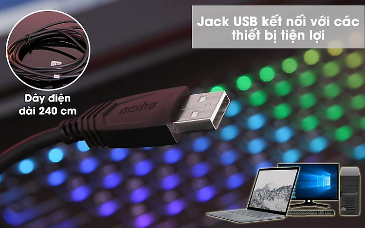 Thoải mái sử dụng tai nghe với chiều dài dây lên đến 240 cm, không lo bị thiếu dây, Cùng với cổng kết nối USB tiện lợi cho phép kết nối được hầu hết các loại laptop, máy tính để bàn.