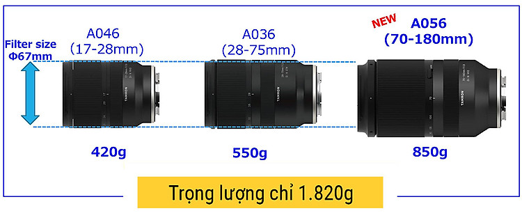 Tamron 70-180mm F/2.8 FE được phát triển với kính lọc 67mm như tất cả các lens Tamron Sony FE đã được ra mắt trước đó. Đây là một lợi thế lớn so với các dòng sản phẩm hiện có trên thị trường, khi mà bạn chỉ cần 1 kính lọc ND, 1 kính lọc CPL, và các loại kính lọc hiệu ứng khác cho dải len 17-28mm, 28-75mm và 70-180mm. Đem đến sự tiện dụng nhất và tối giản các thiết bị phải mang theo cho chuyến đi của bạn.
