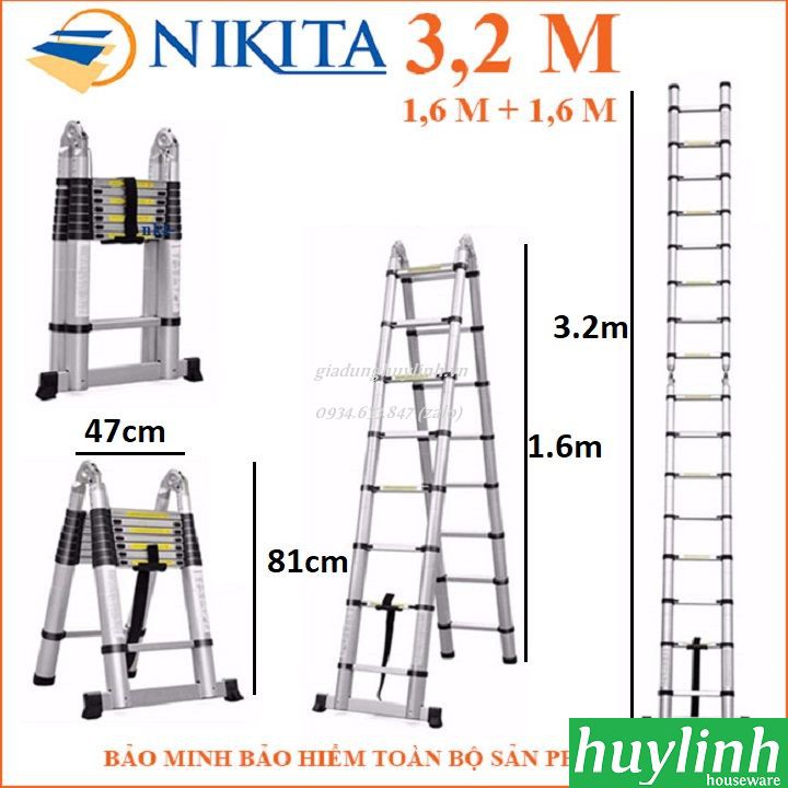 Thang nhôm rút đôi Nikita AI32 với kích thước duỗi thẳng chữ A và chữ I là 1.6 và 3.2 mét, dễ dàng thu gọn để sử dụng và di chuyển.