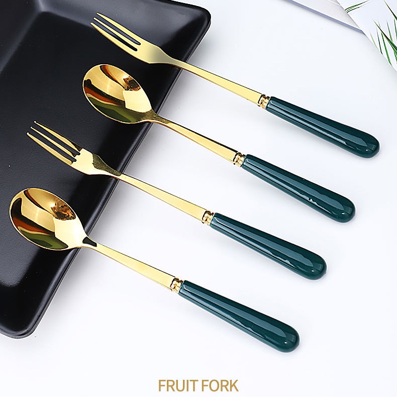 Thìa dĩa mạ vàng cán sứ màu xanh nĩa ăn trái cây / muỗng cà phê dài 15cm
