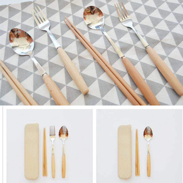 - Bộ gồm đũa, thìa và dĩa inox rất đẹp cán gỗ sồi, đựng trong 1 hộp nhựa lúa mạch sang trọng. Dùng mang cơm đi làm, mang đi du lịch hay picnic tiện lợi.
