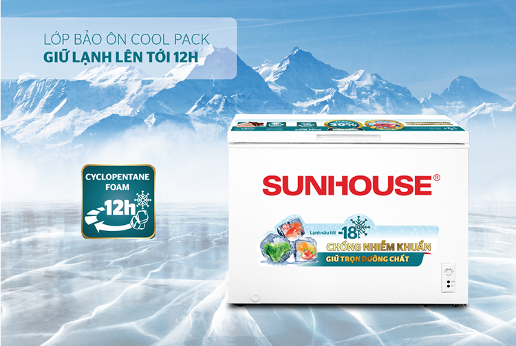 Lớp bảo ôn Cool Pack: sử dụng chất liệu Cyclopentane Foam an toàn, giúp tủ đông giữ lạnh tới 12H ngay cả khi ngắt nguồn. Đồng thời, lớp bảo ôn Cool Pack còn giúp tủ đông cách nhiệt hiệu quả, giảm tác động tiêu cực từ nhiệt độ môi trường bên ngoài, bảo toàn hơi lạnh bên trong, duy trì mức lạnh sâu tới <= -18 độ C.