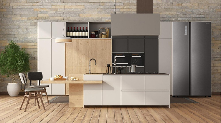 - Đây là mẫu tủ lạnh cỡ lớn Side by side có màu xám và được làm bằng thép không gỉ tạo sự sang trọng. Phần tay cầm được thiết kế âm tủ dọc cánh tủ tạo vẻ ngoài tinh tế, tối giản.