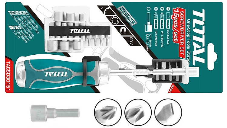 Bộ tua vít 15 chi tiết đa năng TOTAL TACSD30156 là bộ tua vít 15 chi tiết trong đó có 1 tay cầm chắc chắn và cứng cáp cùng với 14 mũi vít khác nhau có thể sử dụng để tháo lắp hầu hết các thiết bị trong gia đình