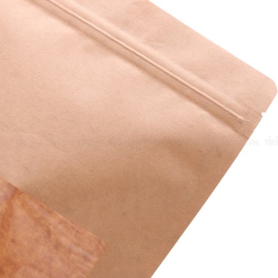 Cấu trúc vật liệu túi: Kraft/PET/PE - PE/PET/Kraft. Các lớp vật liệu thông minh này có tính năng rào cản chống thấm khí, chống thấm ẩm rất tốt. Cửa sổ trong suốt mặt trước túi cho phép thể hiện sản phẩm bên trong. ngoài ra chất liệu giấy còn tạo cho sản phẩm tính mộc mạc, gần gũi với thiên nhiên và thân thiện với môi trường.