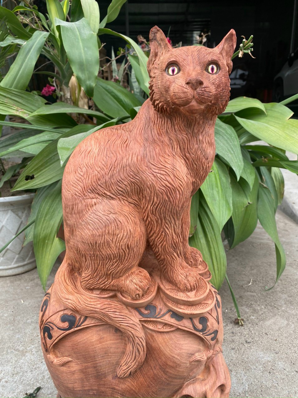 _ Tượng con mèo phong thủy ngồi trên bao tiền được làm bằng chất liệu gỗ hương tự nhiên 100%